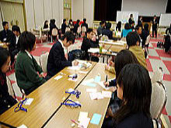 | 「グループ討議」 テーマ:『あなたなら100円で何を考えますか?』 三重大学の大学院生&大学生がグループリーダーとなって進行して、高校生たちの意見をまとめました。 |