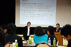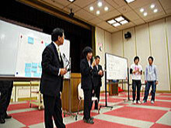 | 「田口社長と語る」 グループ討議を終えての、各グループ代表による発表 皆さん緊張しながらも、しっかりと自分たちの考えを述べていました。 |